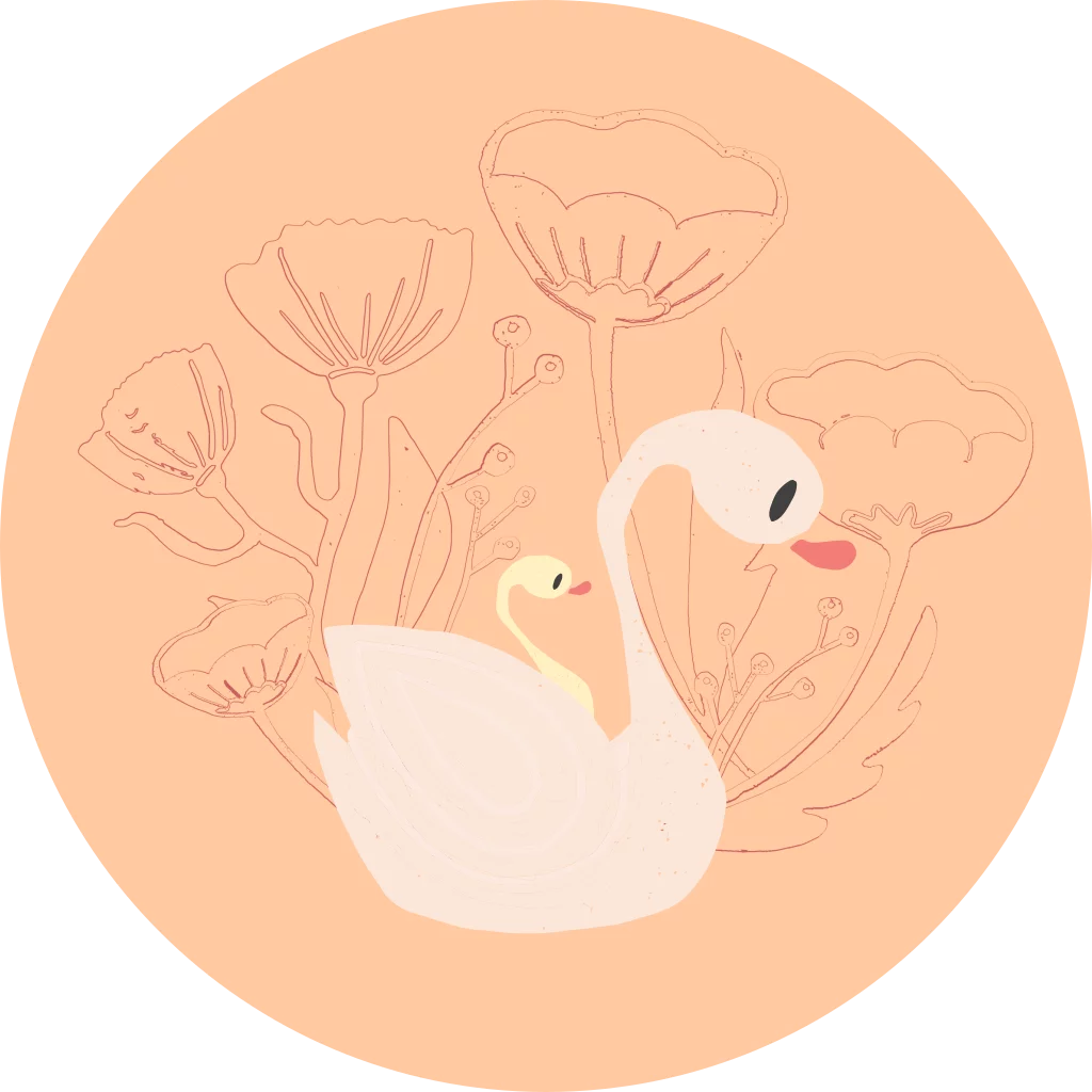 Een vrolijke en prachtige sluitsticker met peach/oranje kleurige achtergrond. Daarop zie je een illustratie van twee zwaantjes en een lijntekening van bloemen. Pas het ontwerp naar wens zelf aan.