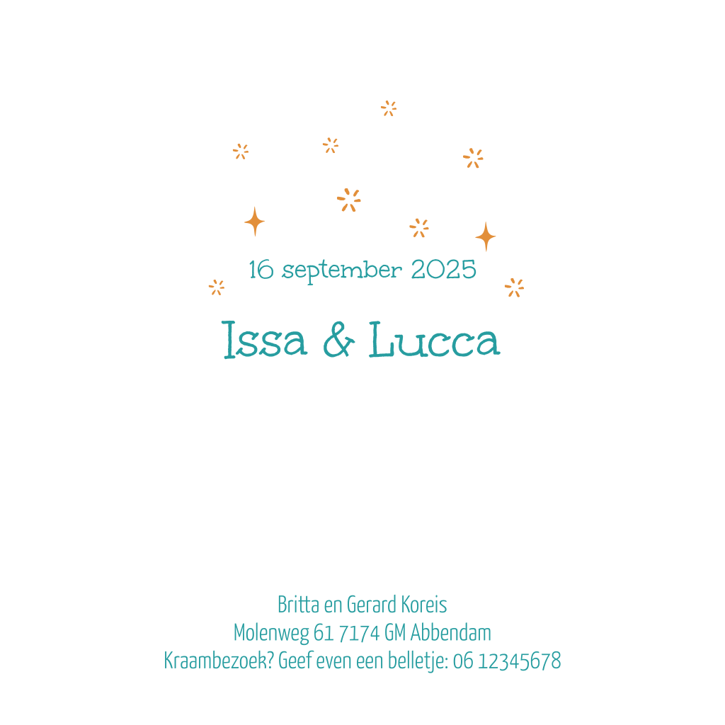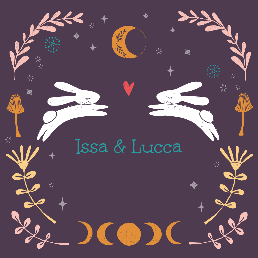 Vrolijk geboortekaartje voor tweelingmeisjes of tweelingjongetjes met schattige konijntjes, bohemian maantje en folklore elementjes. Pas het kaartje naar wens aan in onze online editor.