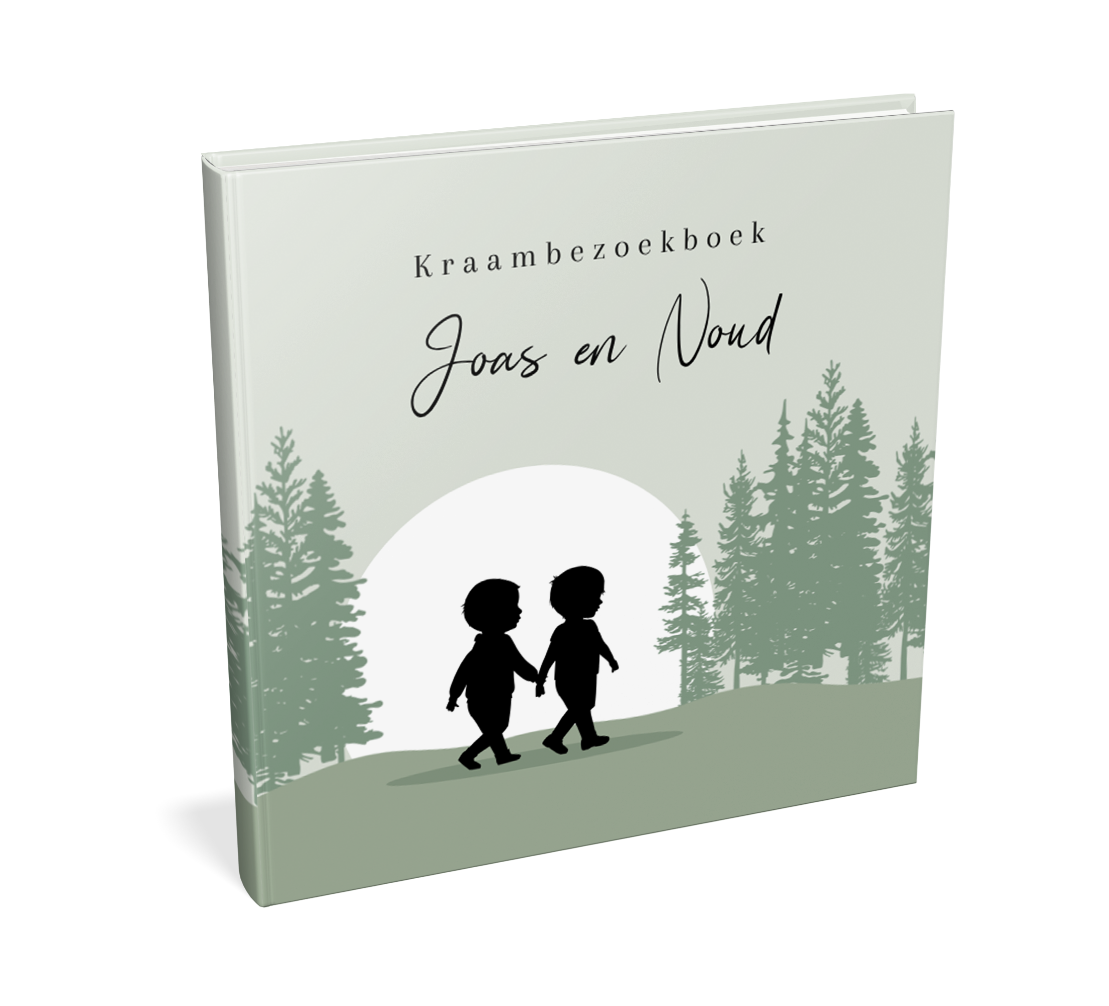 Dit is een mooi kraambezoekboek. In een groen landschap loopt een tweeling hand in hand. De voor- en achterkant van dit boek zijn naar wens aan te passen in onze online editor.