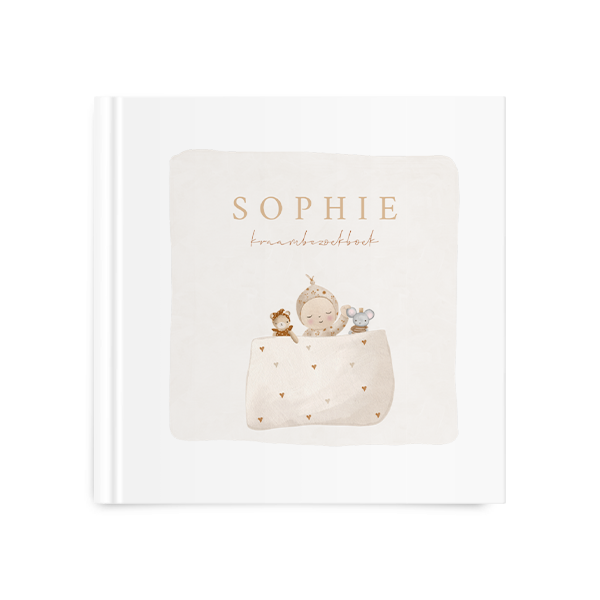 Een schattig kraambezoekboek voor jouw kindje. De kaft heeft een beige kader met in het midden een illustratie van een baby onder een hartjes deken. Pas het ontwerp naar wens aan in onze online editor.