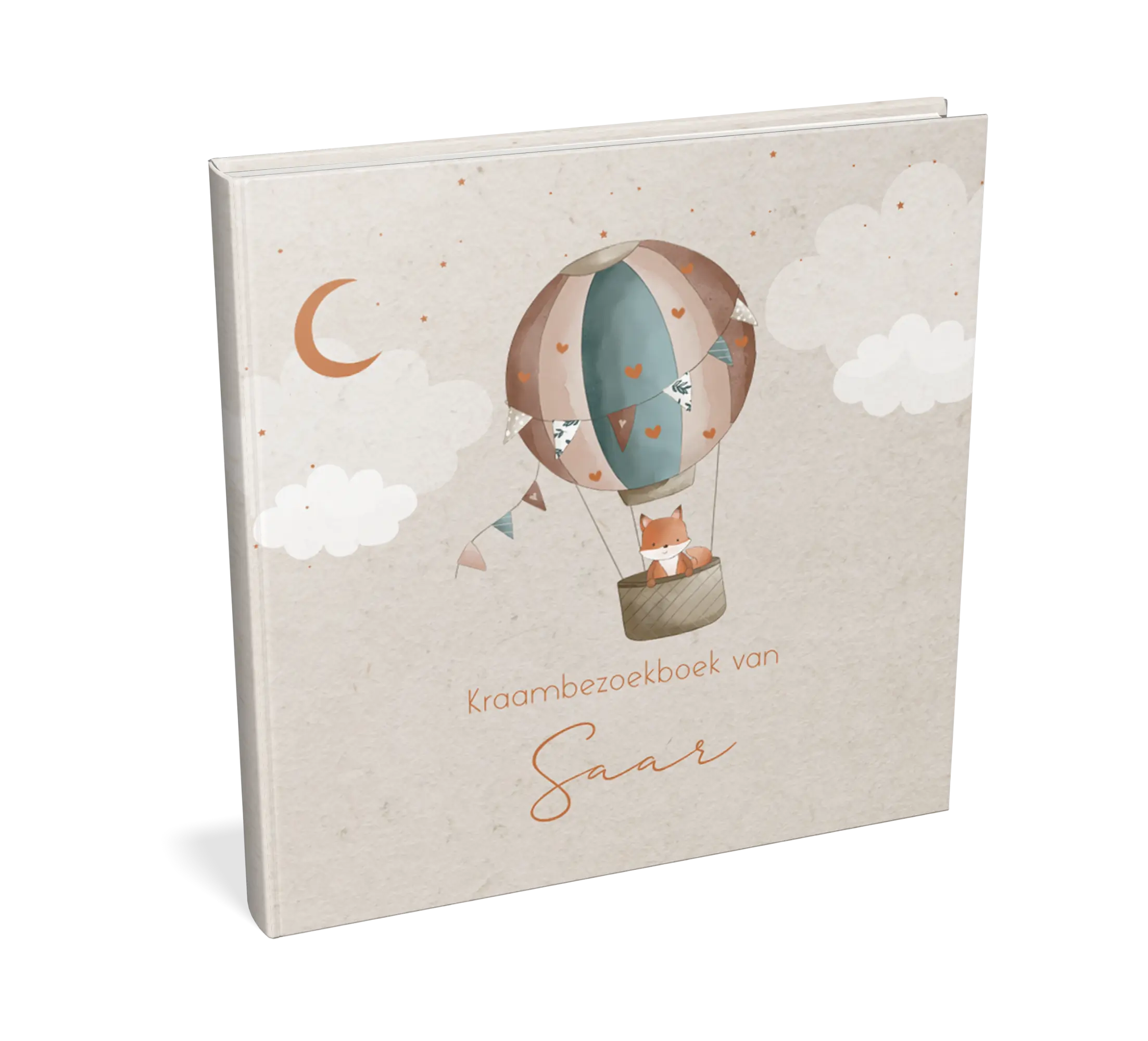 Een vrolijk en dromerig kraambezoekboek voor jouw kindje. De kaft heeft een beige achtergrond met daarop een luchtballon en vosje. Ook zie je wolkjes en een maantje. Pas het ontwerp naar wens zelf aan.