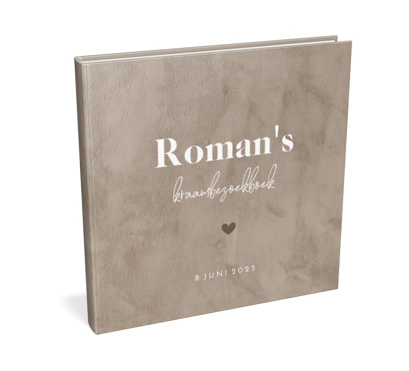 Bewaar herinneringen aan de kraamtijd van jullie zoontje in dit stoere kraambezoekboek in beige velvet-look! De naam is in witte letters, dat valt mooi op, eronder een klein bruin hartje.
