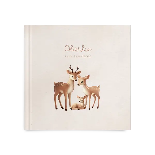 Dit mooie kraambezoekboek in beige tinten heeft een lief hertengezin op de voorgrond. Pas het ontwerp eenvoudig aan in de online editor.