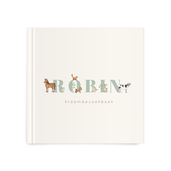 Een vrolijk kraambezoekboek passend bij het geboortekaartje. Op deze kaft zie je verschillende illustraties van boerderijdieren. De kaft pas je gemakkelijk aan in onze online editor.