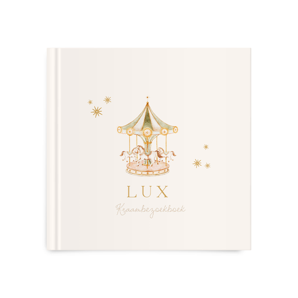 Een tof kraambezoekboek voor tijdens de kraamperiode. Het boek heeft een lichte kaft met daarop een illustratie van een carrousel. Pas het ontwerp naar wens aan in onze online editor.