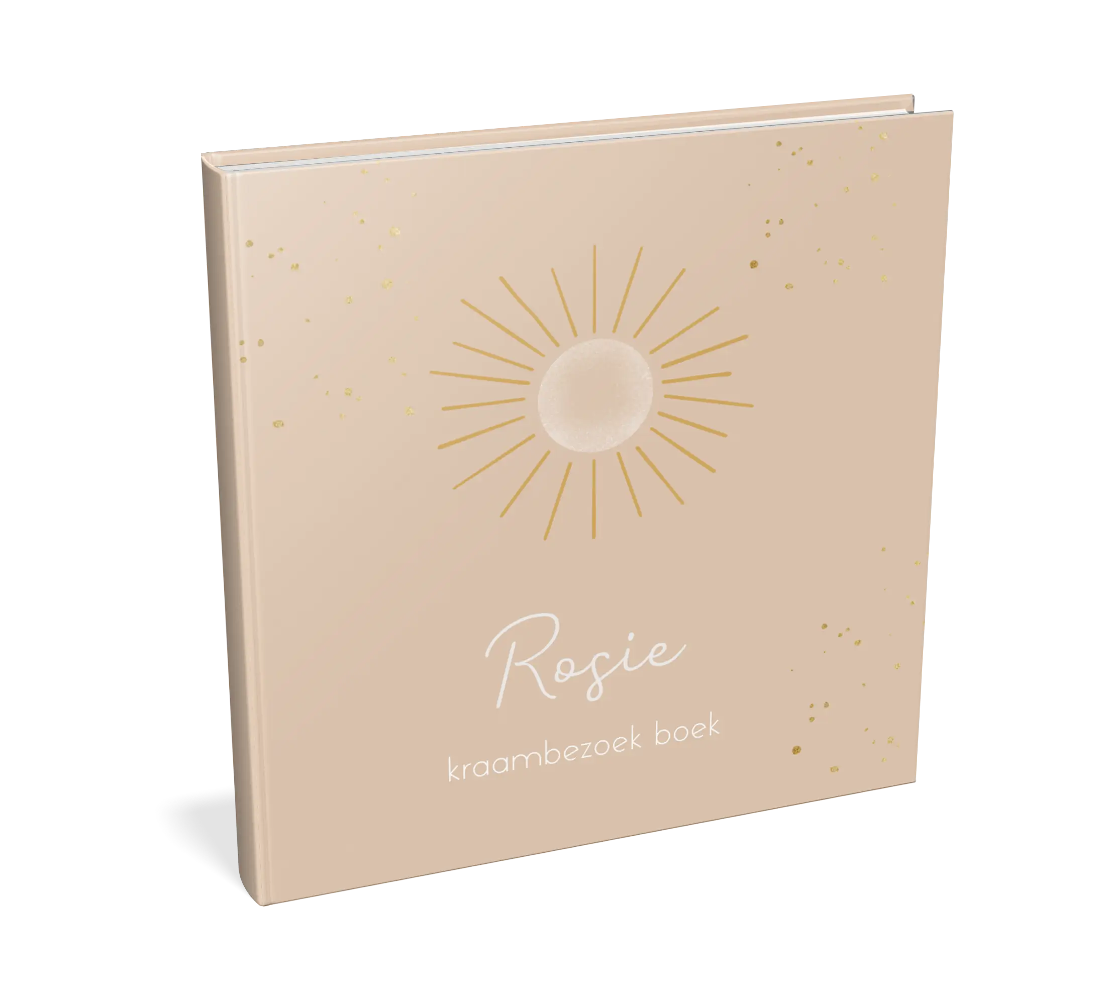 Kraambezoek met neutrale tinten. Het boek heeft een goudkleurige zon. Het boek is naar wens aan te passen in de online editor.