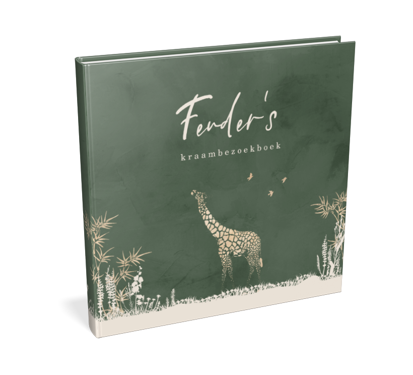 Bewaar de herinneringen aan de kraamtijd voor jullie zoontje in dit toffe kraambezoekboek in groene velvet-look! Langs de onderrand zie je een landschap in beige zandkleur, onder de naam in trendy letters staat een giraffe op de voorzijde.
