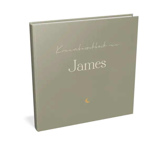 Een stijlvol kraambezoekboek voor jouw kindje. Het boek heeft een legergroene achtergrond met daarop een goudkleurig maantje. Pas de kaft naar wens aan in onze online editor.