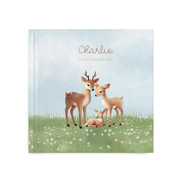 Dit mooie kraambezoekboek heeft een lief hertengezinnetje op de voorkant. Op de achtergrond zie je een mooi getekend landschap van gras en bloemetjes. Pas het ontwerp naar wens aan in de online editor.