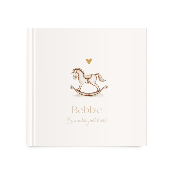 Dit is een lief kraambezoekboek. Op het boek staat een illustratie van een hobbelpaardje. De voor- en achterkant van het boek kunnen aangepast worden in onze online editor.