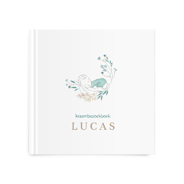 Een tof kraambezoekboek voor jouw zoon. De kaft heeft een lieve tekening van een jongen tussen de bloemen. Pas het ontwerp naar wens aan in onze online editor.