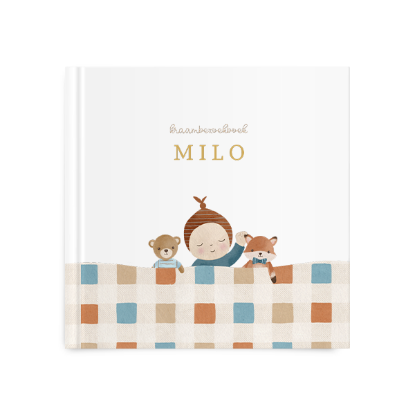 Wat een lief kraambezoekboek! De kaft heeft een illustratie van een kindje onder een dekentje met knuffels. Pas het ontwerp naar wens aan in onze online editor.