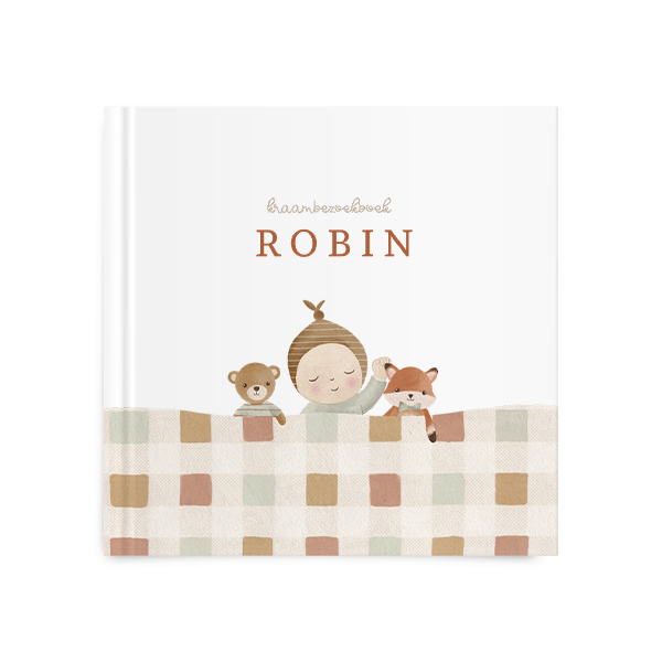 Wat een lief kraambezoekboek! Dit boek heeft een illustratie van een kindje onder een dekentje met knuffels. Pas het ontwerp naar wens aan in onze online editor.