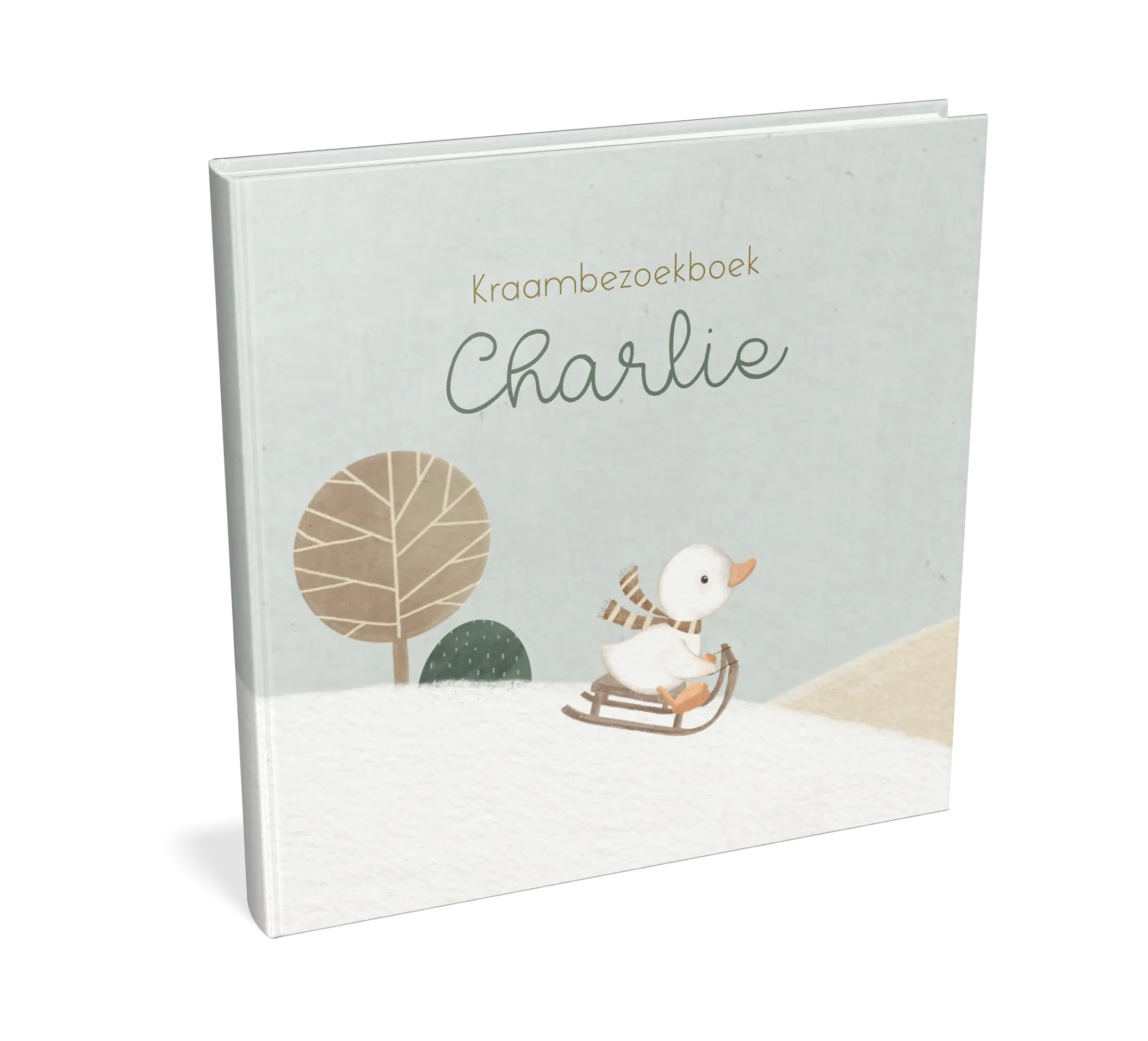 Dit is een lief kraambezoekboek. Een eendje is aan het sleeën door een winters landschap. Zowel de voor- als achterkant van het boek kan aangepast worden in onze online editor.