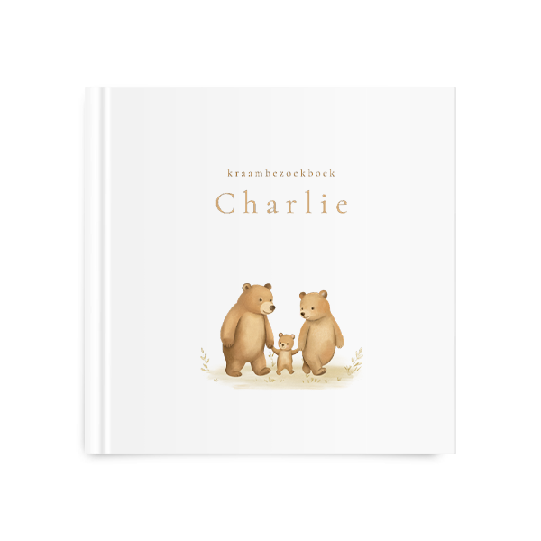 Een lief kraambezoekboek bijpassend bij het geboortekaartje. De kaft heeft een lieve illustratie van een berenfamilie in het gras. Pas het ontwerp naar wens zelf aan.