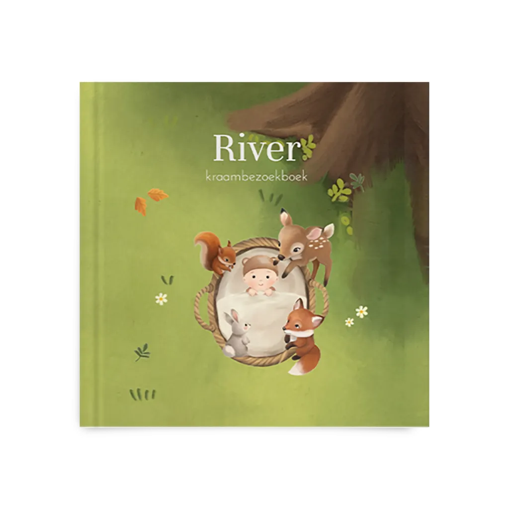 Een lief kraambezoekboek met illustratie van lieve bosdieren en baby in een mandje. Pas de kaft naar wens zelf aan.