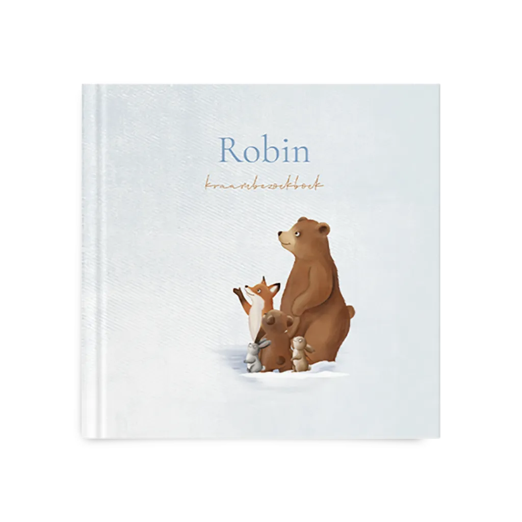 Een lief kraambezoekboek met illustraties van lieve winterdieren. Pas de kaft naar wens zelf aan.