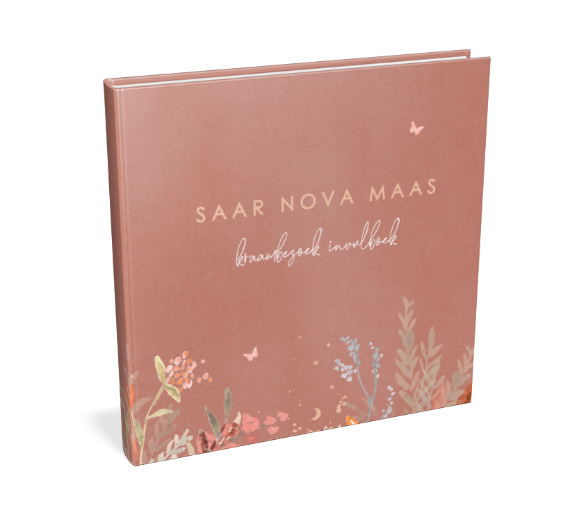 Lief, dit kraambezoekboek voor een dochtertje! Op de oudroze-peach achtergrond in watercolour-stijl staat een rand van kleurrijke bloemen en takjes. Bij de naam en boven de bloemen zie je kleine vlindertjes fladderen.