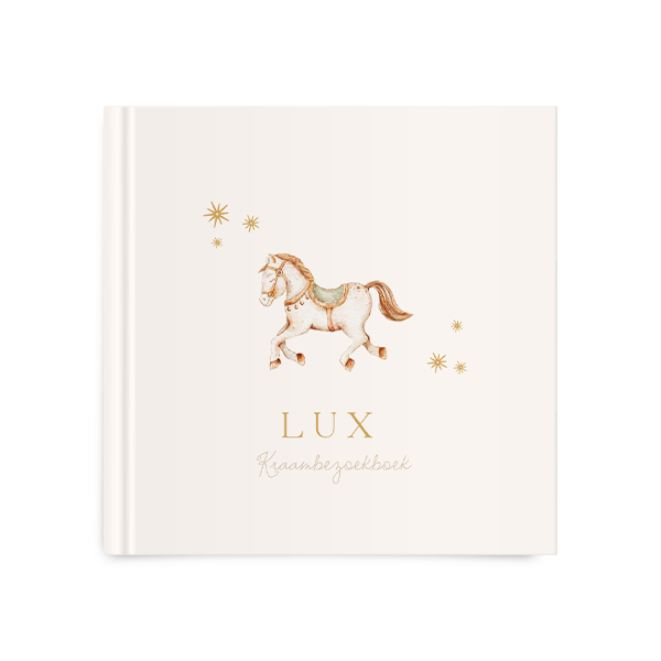 Een kraambezoekboek in de stijl van het geboortekaartje. Het boek heeft een lichte achtergrond met daarop een illustratie van een paardje. Pas de kaft naar wens aan in onze online editor.