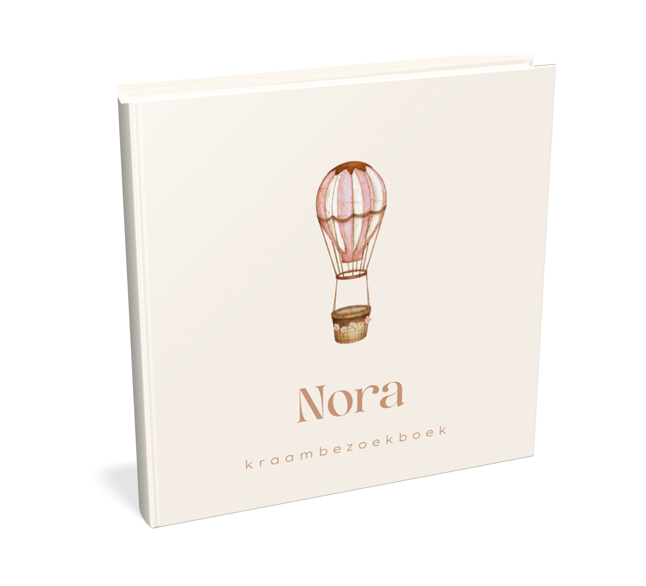 Dit is een lief kraambezoekboek. Op het boek staat een illustratie van een roze luchtballon. De voor- en achterkant van het boek kunnen aangepast worden in onze online editor.