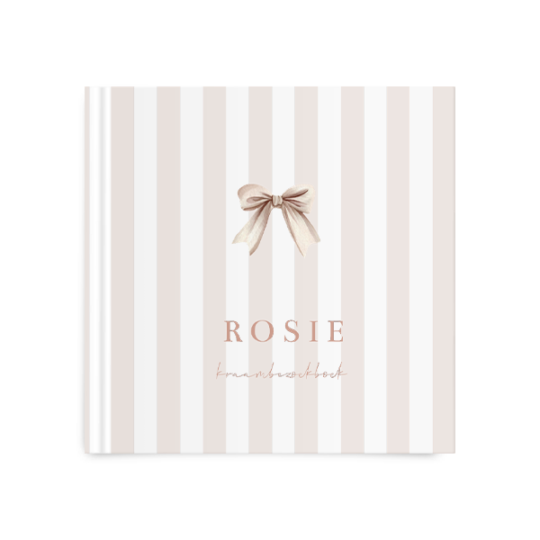 Een lief kraambezoekboek voor een meisje. De kaft heeft een streepjes achtergrond met daarop een illustratie van een strikje. Pas het ontwerp naar wens aan in onze online editor.