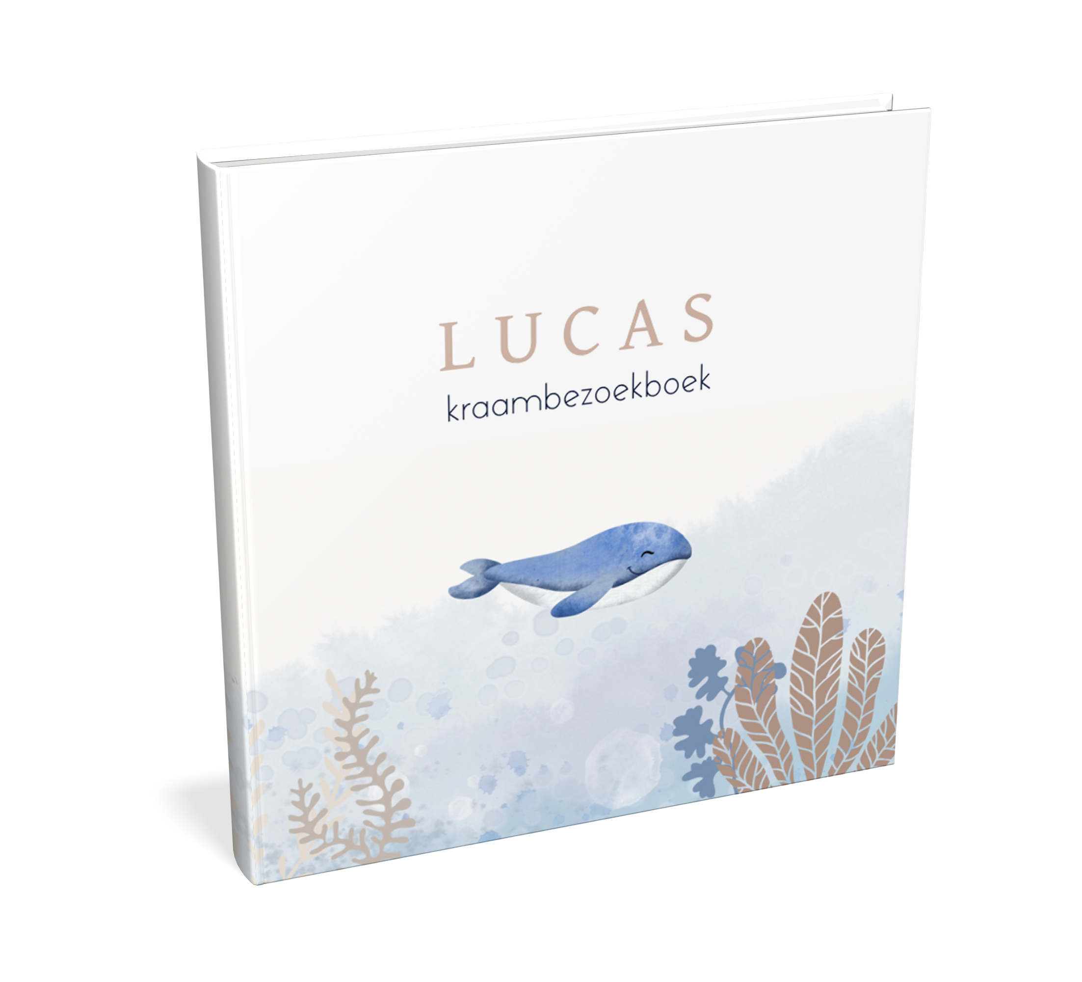 Dit is een mooi kraambezoekboek. Het boek heeft een blauwe watercolour achtergrond met de illustratie van een walvis en zeeplanten. Pas het boek helemaal naar wens aan in onze online editor.
