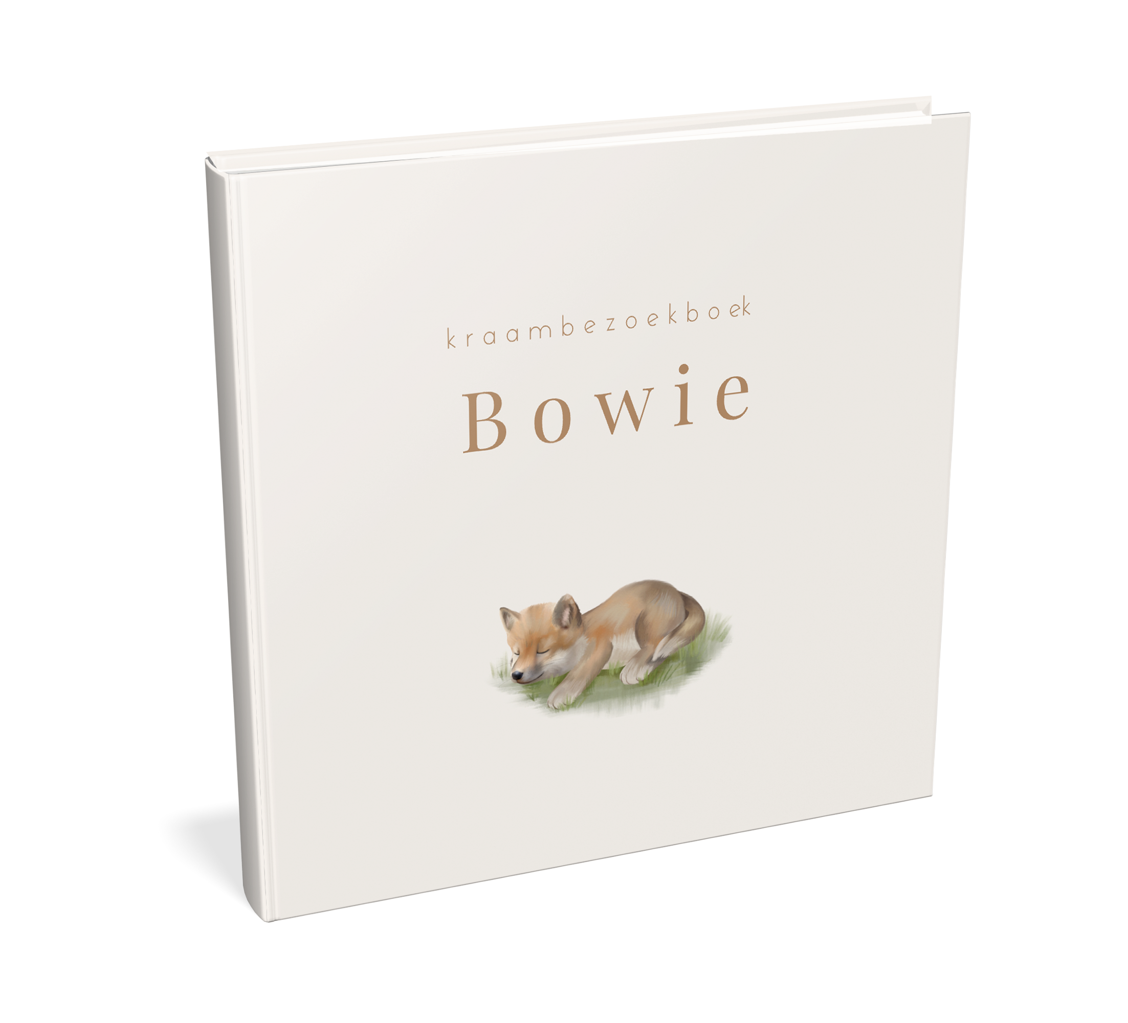 Op dit kraambezoekboek is een slapende wolf in het gras te zien. Het boek is naar wens aan te passen in onze online editor.