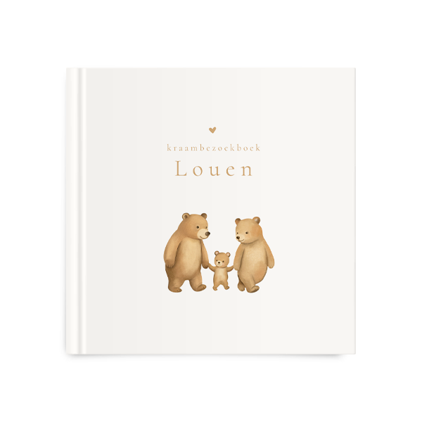 Een lief kraambezoekboek voor jouw kindje. Het boek heeft een lichte achtergrond met daarop een berengezin dat hand in hand loopt. Pas het kraamboek naar wens aan in onze online editor.