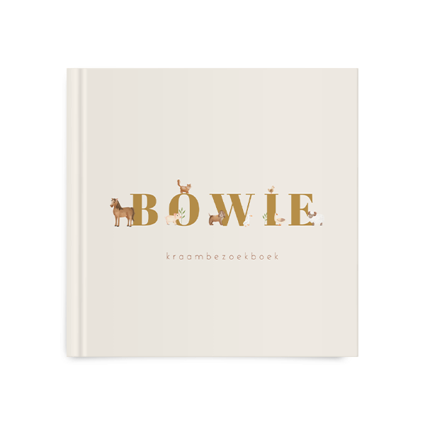 Een vrolijk kraambezoekboek passend bij het geboortekaartje. Op deze kaft zie je verschillende illustraties van boerderijdieren. De kaft pas je gemakkelijk aan in onze online editor.