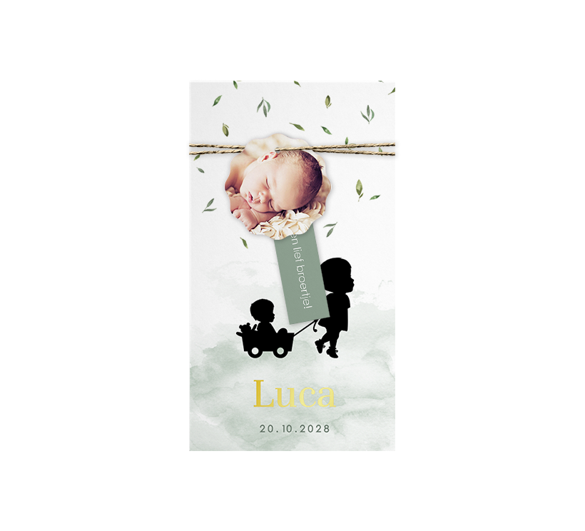 Een label geboortekaartje bestaande uit 3 delen voor een jongetje. Op het grootste kaart je lees je zijn naam en zie je een silhouetje van een jongetje met zijn grote zus. De achtergrond heeft een groene watercolour. Het tweede labeltje heeft een foto en het derde heeft een lief tekstje. De labeltjes kunnen aan elkaar worden vastgemaakt door middel van een lintje of touwtje.