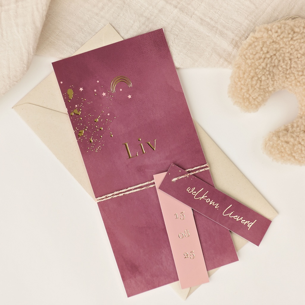 Dit is een prachtig geboortekaartje voor jullie dochter. Het kaartje heeft een paarse velvet-look achtergrond met goudfolie opdruk. Bij het kaartje horen twee labels. Op het ene label kan een lief tekstje worden geplaatst en op het andere label de geboortedatum van jullie kleintje. Het kaartje heeft een formaat van 21 × 10 cm. De bijpassende envelop die je kunt bestellen is 22 × 11 cm, zodat het kaartje er perfect in past.