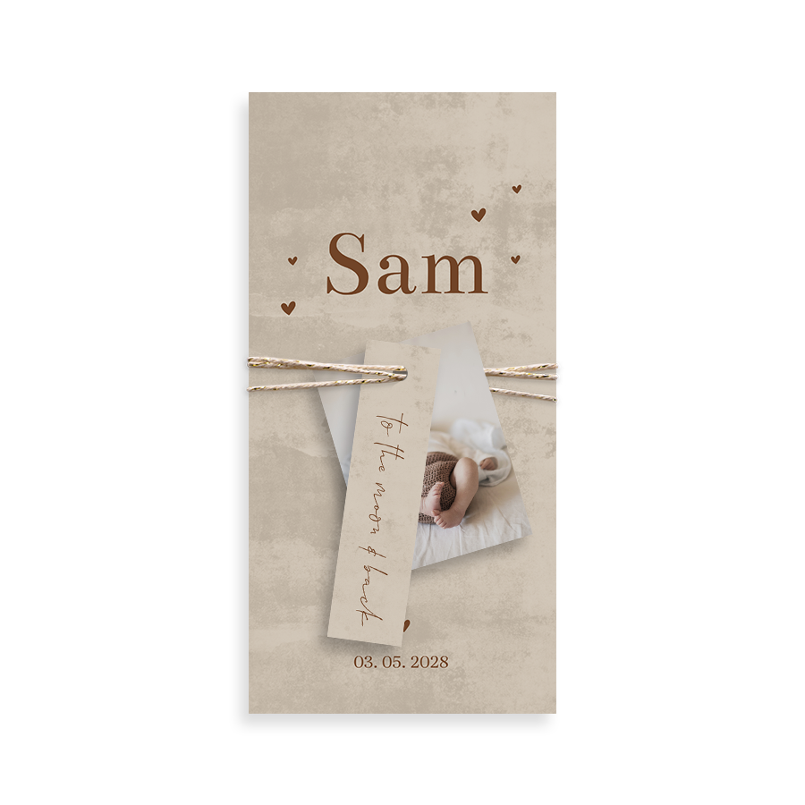 Goed om te weten: Op het voorbeeld zijn de kaartjes met een touwtje aan elkaar bevestigd. Het touw wordt niet standaard meegeleverd, maar je kunt het eenvoudig toevoegen tijdens het bestelproces. Alle bevestigingsmaterialen vind je hier. Wanneer je de geboortekaartjes ontvangt, kun je het touw er zelf omheen binden en de kaartjes zo in elkaar zetten.