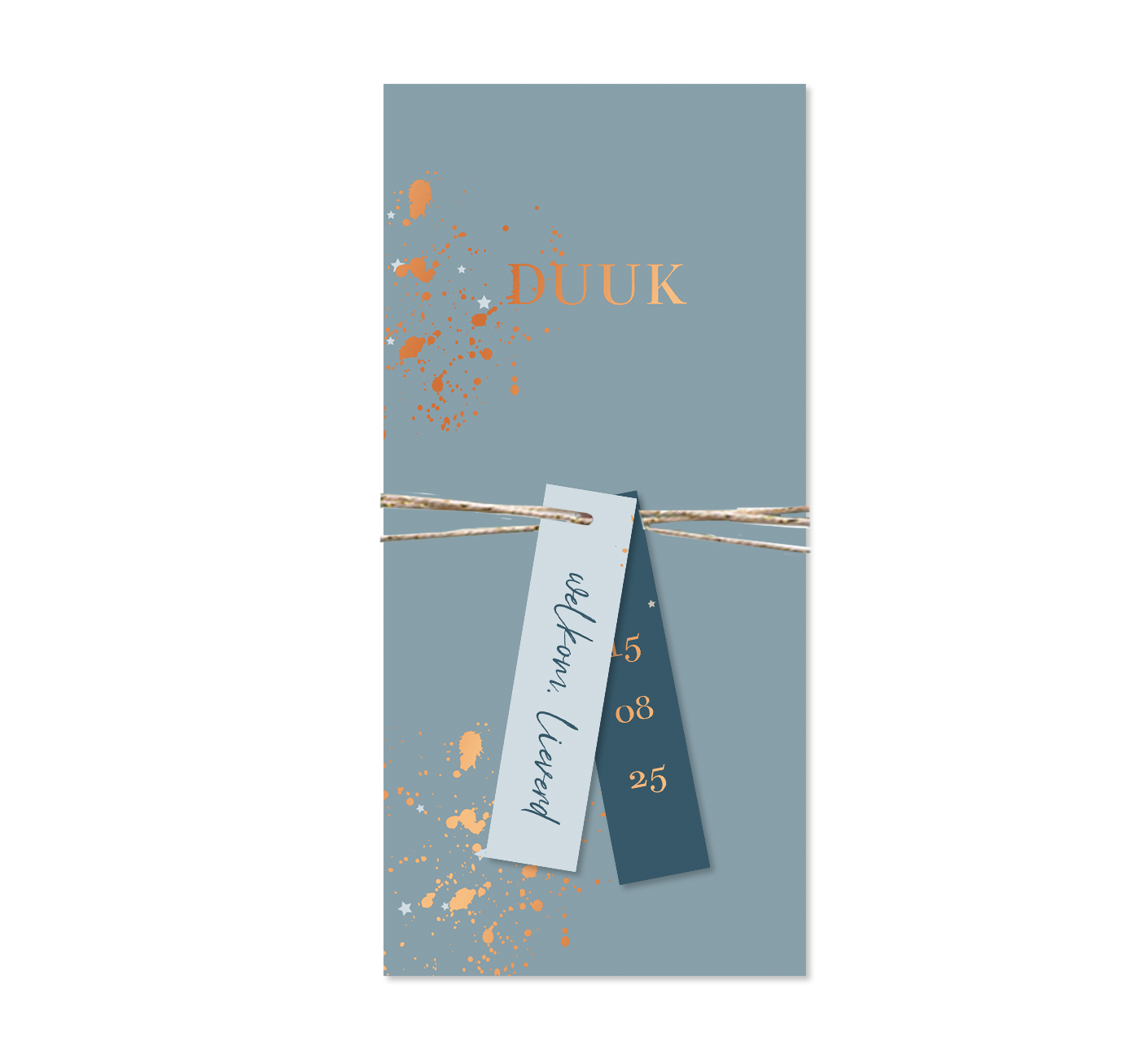 Goed om te weten: Op het voorbeeld zijn de kaartjes met een touwtje aan elkaar bevestigd. Het touw wordt niet standaard meegeleverd, maar je kunt het eenvoudig toevoegen tijdens het bestelproces. Alle bevestigingsmaterialen vind je hier. Wanneer je de geboortekaartjes ontvangt, kun je het touw er zelf omheen binden en de kaartjes zo in elkaar zetten.