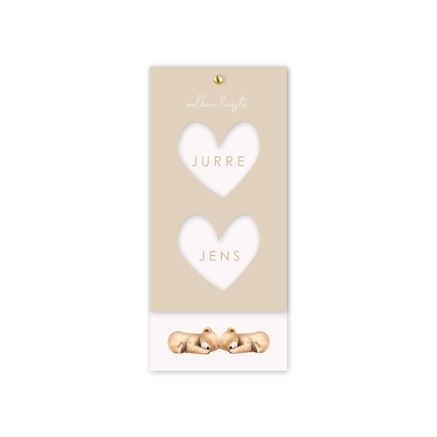 Dit lieve label geboortekaartje met doorkijkjes in de vorm van hartjes is de perfecte manier om de geboorte van jullie tweeling aan te kondigen. De beigetinten en de twee schattige, slapende beertjes zorgen voor een lieve en rustige uitstraling. Pas het ontwerp helemaal naar wens aan in de online editor.