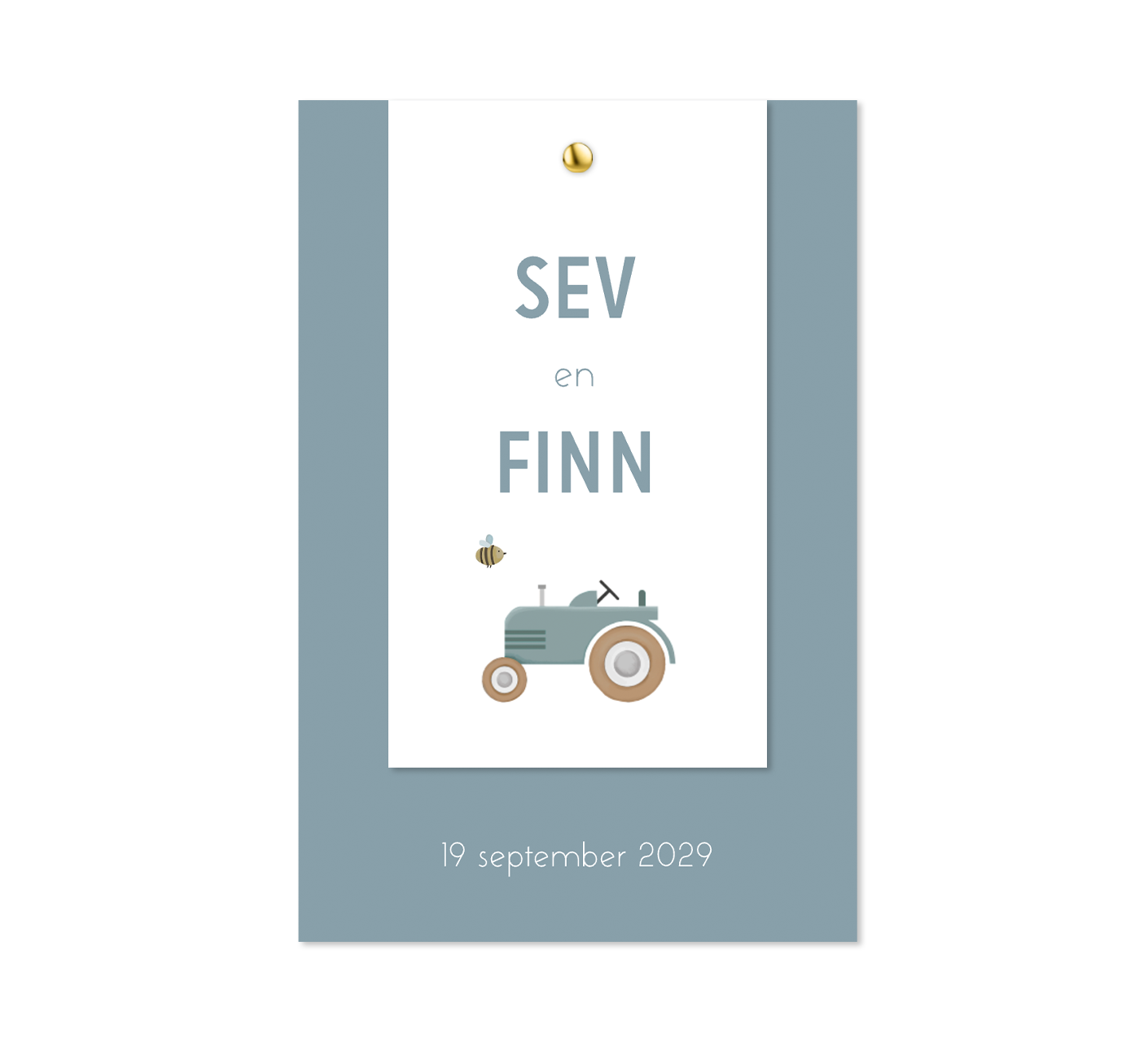 Tof geboortekaartje voor de geboorte van jullie tweeling. Dit label geboortekaartje heeft twee labels met op het voorste labeltje een illustratie van een tractor. Het achterste labeltje heeft een blauwe kleur. Het kaartje heeft een formaat van 11x17 cm. De bijpassende envelop die je kunt bestellen is 12 x 18 cm, zodat het kaartje er perfect in past.