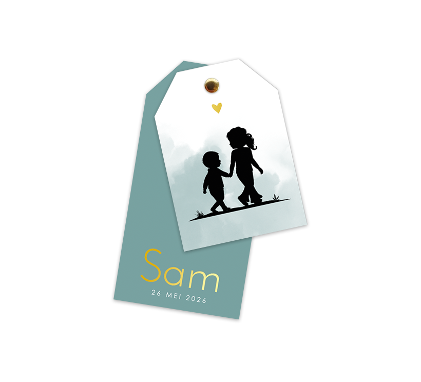 Een schattig en stijlvol label geboortekaartje voor jullie tweede kindje. De achtergrond van het voorste kaartje heeft een blauwe watercolour. Daarop zie je twee silhouetjes van een grote zus met haar broertje. De naam is gedrukt in goudfolie. De bijpassende envelop die je kunt bestellen is 12 x 18 cm, zodat het kaartje er perfect in past.
