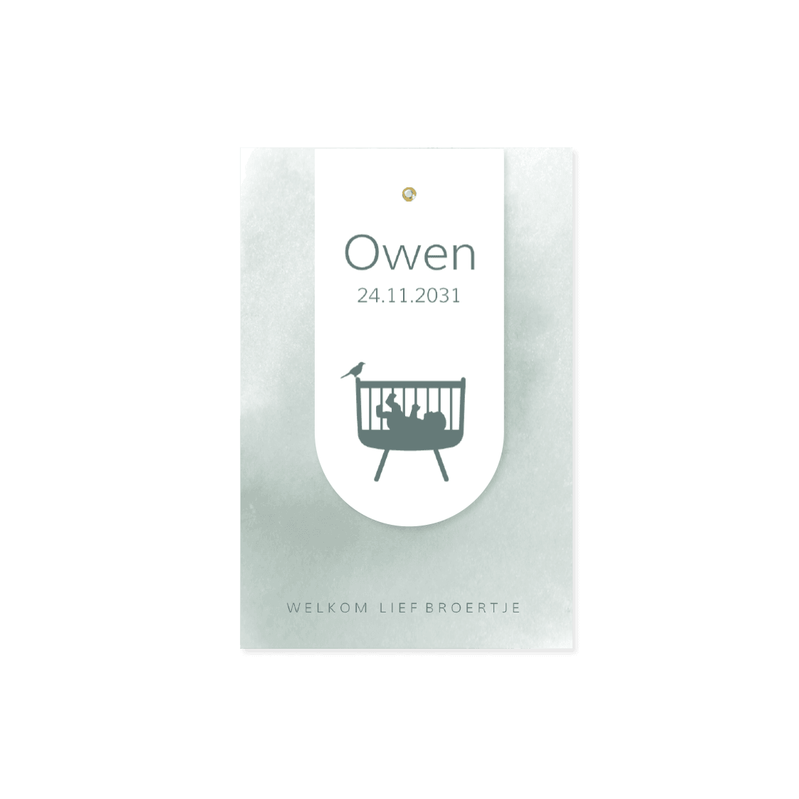 Een lief groen label geboortekaartje voor jouw kindje. Het kaartje heeft een groene watercolour met een silhouet wiegje met baby. Het kaartje bestaat uit twee delen.