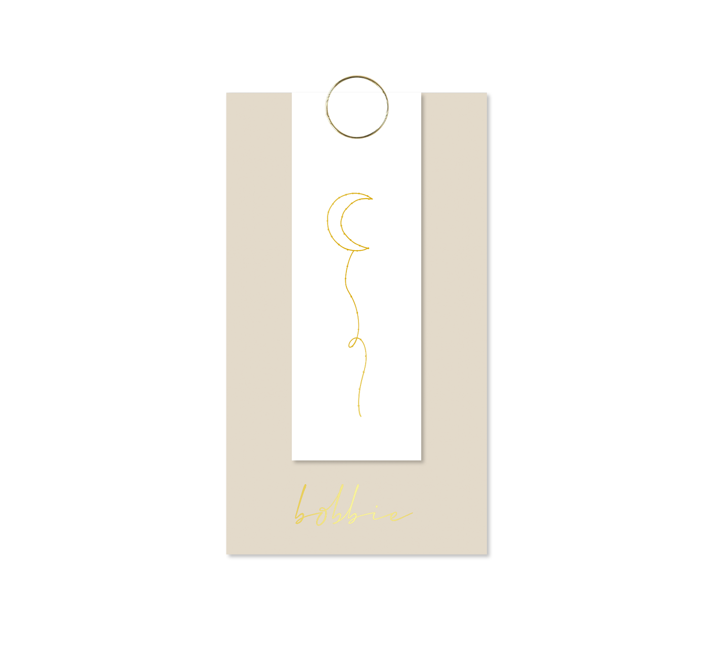 Wat een tof en origineel geboortekaartje voor jouw kindje. Het kaartje heeft een beige achtergrond met daarop een wit labeltje. Op dit witte labeltje zie je een goudfolie maantje. De labels kan je aan elkaar vastmaken door middel van een paperclip. De bijpassende envelop die je kunt bestellen is 12 x 18 cm, zodat het kaartje er perfect in past.