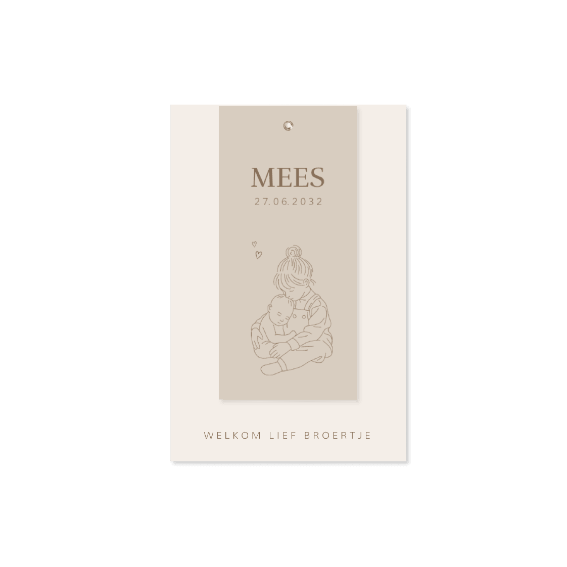 Een lief beige label geboortekaartje voor jouw tweede kindje. Het kaartje heeft een beige achtergrond met een lijntekening van een grote zus samen met haar zusje of broertje. Het kaartje bestaat uit twee delen.