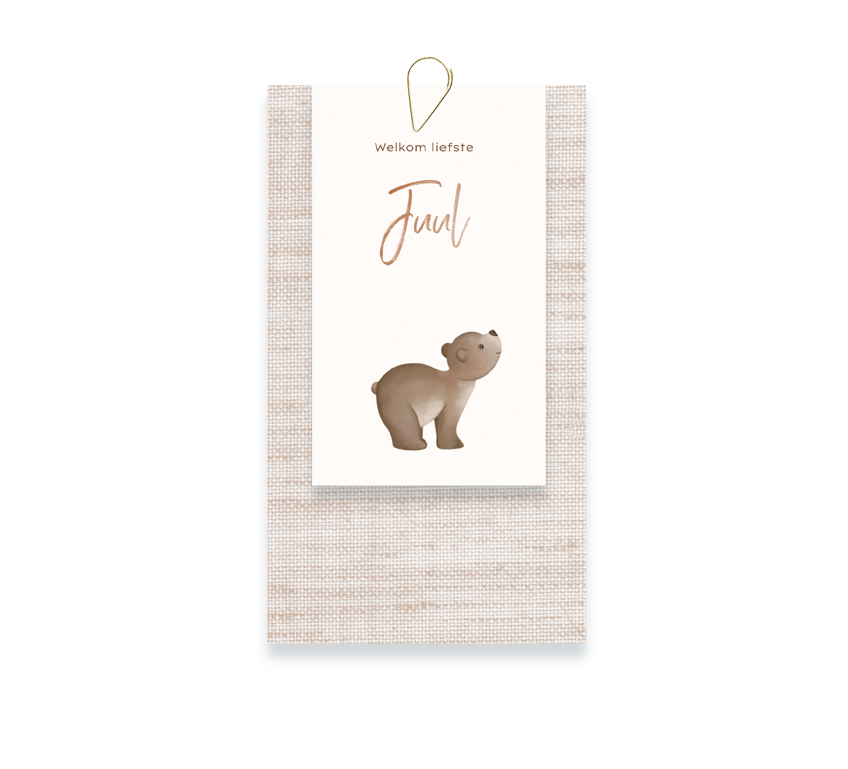 Een stijlvol neutraal geboortekaartje. Het label geboortekaartje bestaat uit twee losse labels. Het achterste kaartje heeft een beige linnenlook. Het voorste kleine labelkaartje heeft een illustratie van een lief beertje. Pas het kaartje naar wens aan in onze online editor. De daadwerkelijke maat van het kaartje is 11 x 17 cm.