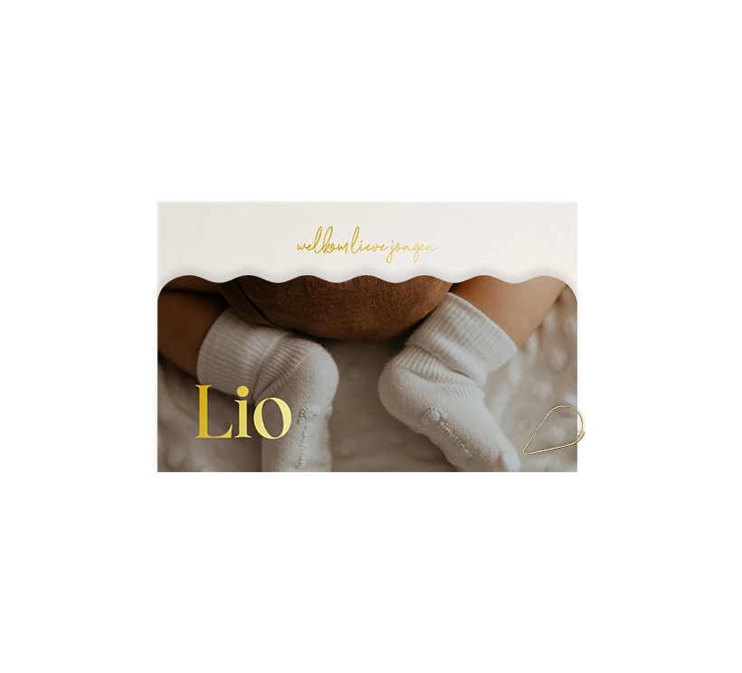 Dit stijlvol en origineel kaartje voor de geboorte van jullie kindje bestaat uit 2 delen. Op de hoofdkaart staat de tekst en op de bovenliggende kaart met de golvende rand plaats je de foto van jullie kindje en de naam hier met goudfolie. Pas het kaartje naar wens aan in onze online editor en bestel snel een proefdruk om dit kaartje in het echt te zien!