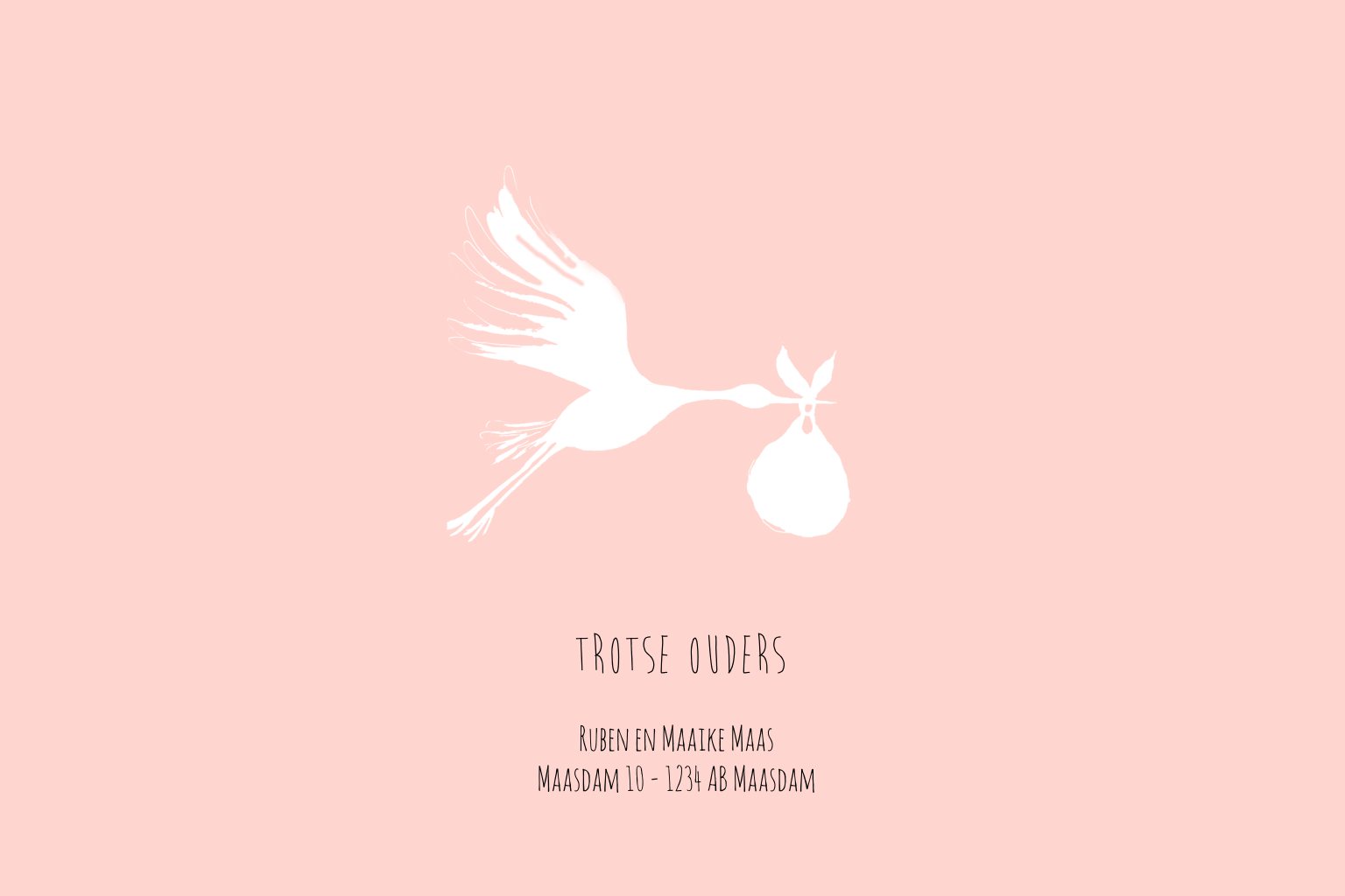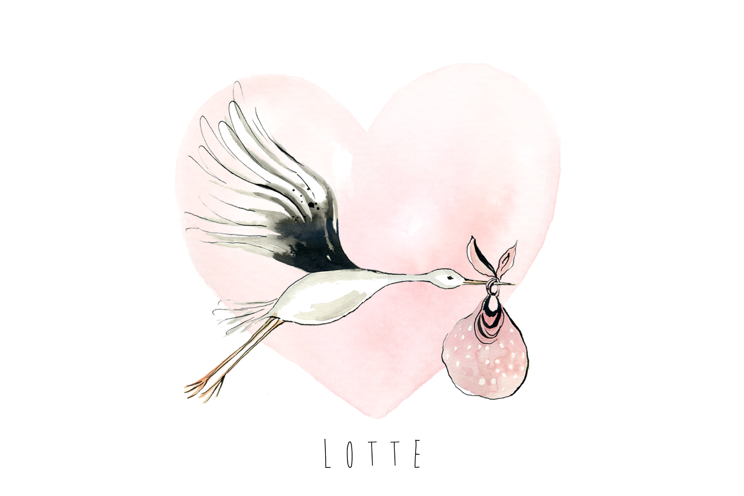 Schattig geboortekaartje voor de geboorteaankondiging van je dochtertje met een unieke aquarel illustratie van een vliegende ooievaar met een zacht roze hartje.