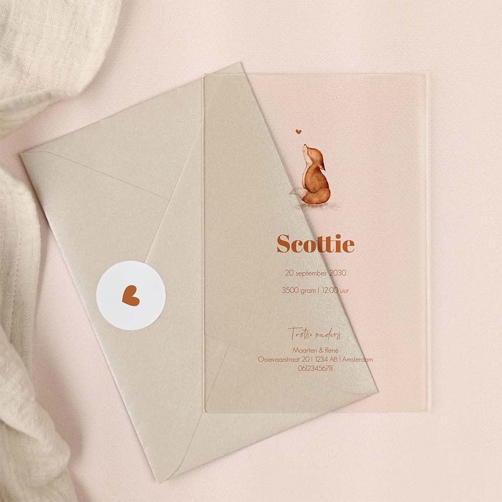 Wat een tof geboortekaartje voor jouw kindje. Dit stoere maar toch lieve geboortekaartje met illustratie van een vosje. Het kaartje is gemaakt van acryl en is naar wens volledig aan te passen.