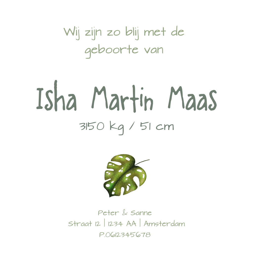 Zet zijn of haarnaam op deze stoere geboortekaart met jungle thema. De bladeren en jungle takken maken het kaartje compleet.