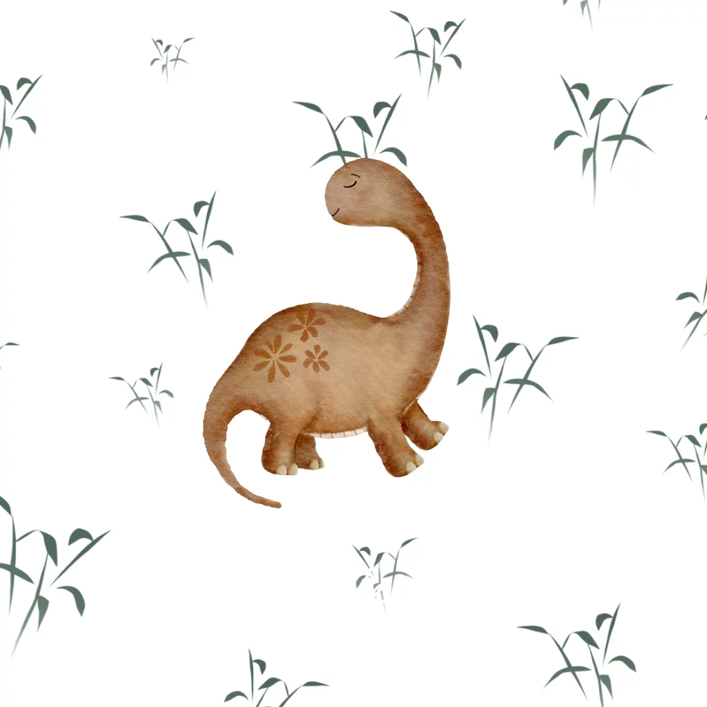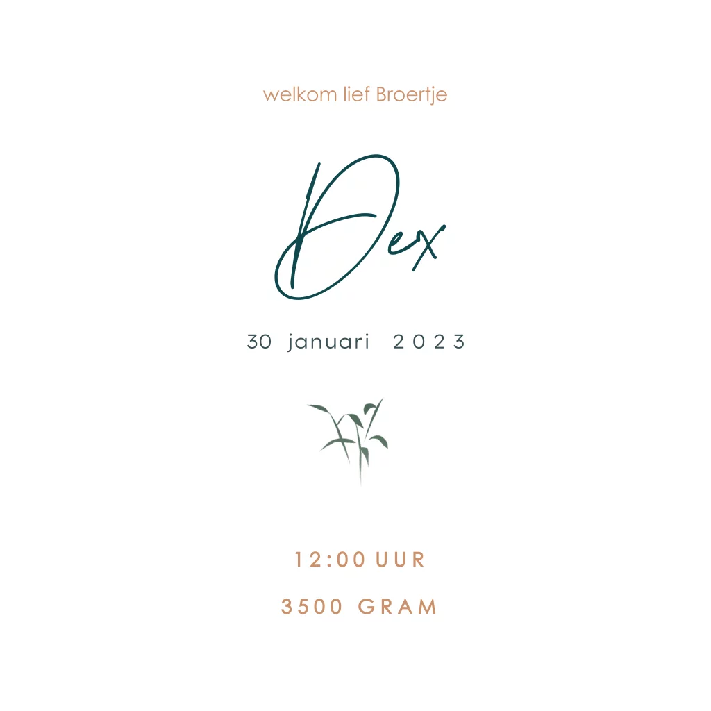 Een avontuurlijk en botanisch geboortekaartje voor een jongen met een illustratie van een dino. De achtergrond met groene takjes maakt dit bijzondere kaartje helemaal af. De naam is gedrukt in goudfolie.