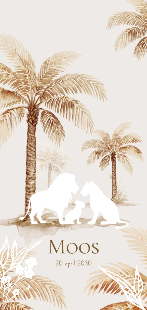 Geboortekaartje met leeuwenfamilie in goudfolie met palmbomen