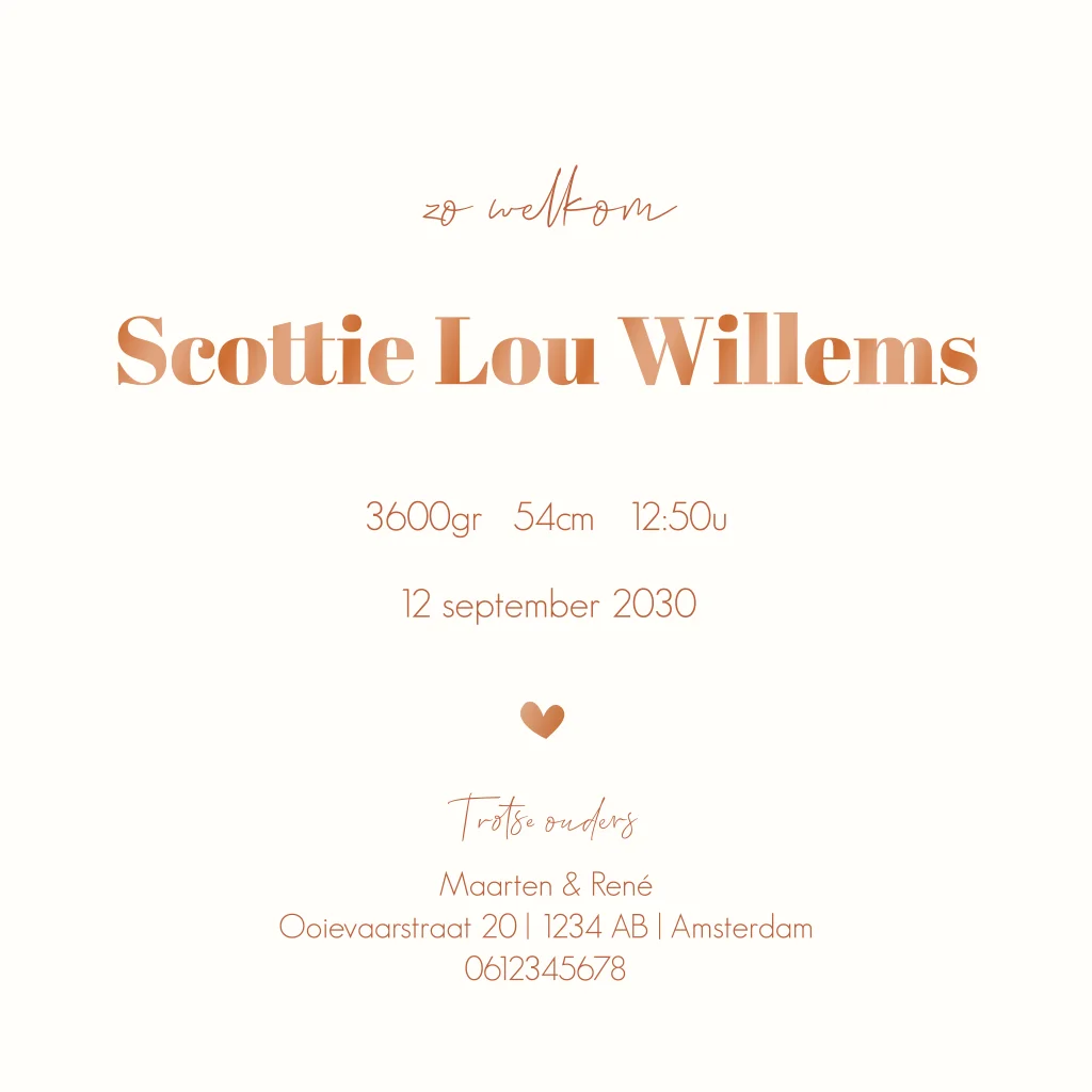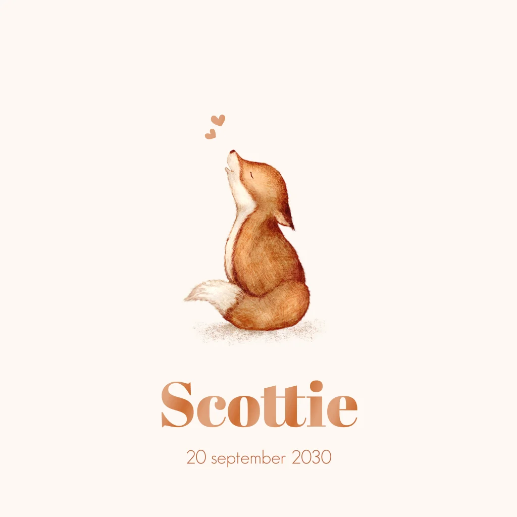 Wat een tof geboortekaartje voor jouw kindje. Dit stoere maar toch lieve geboortekaartje met illustratie van een vosje met hoogglans tekst en hartjes. Het kaartje heeft een vierkant formaat en is naar wens volledig aan te passen.