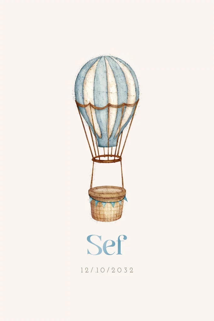 Een lief geboortekaartje voor jullie toekomstige kleintje. Het kaartje heeft een schattige illustratie van een luchtballon. De pastel blauwe tinten maken het kaartje helemaal af. Het geboortekaartje is helemaal naar wens te maken in onze online editor.