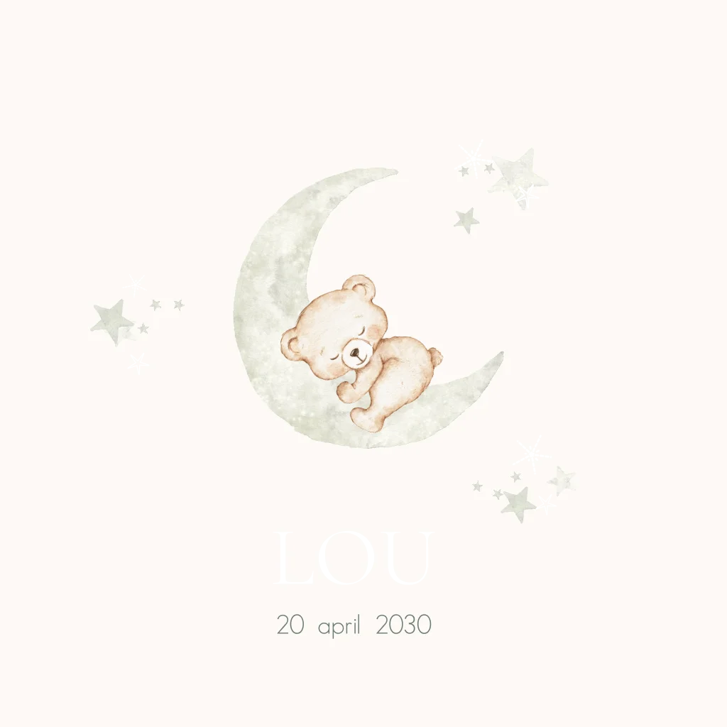 Lief geboortekaartje in zachte beigetinten, verrijkt met goudfolie. De illustratie toont een beige beertje dat op de maan ligt, omringd door aquarel- en goudfolie sterren.Dit product maakt onderdeel uit van deze set.