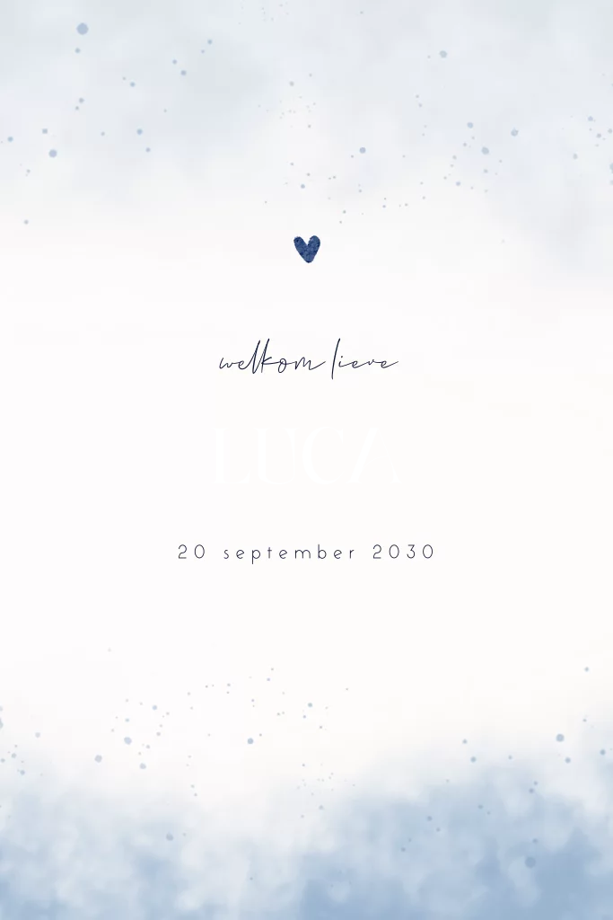 Een stijlvol en hip geboortekaartje voor jullie toekomstige zoontje. Het kaartje heeft blauwe watercolour achtergrond. In het midden lees je de naam van jouw kleintje in goudfolie. Liever een andere kleur? Pas het ontwerp dan naar wens aan in onze online editor.
